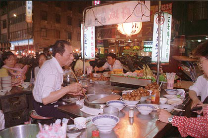 Click! Here you can see a busy street in a night market in Taipei. These markets can go on until midnight. In this picture there are shops all the way down this street. As this street is pedestrianised the vendors have placed an interminable isle of consumer items down it's centre, thus squeezing the preponderance of trendy Taiwanese shoppers into two streams either side. The picture fails to register the teeny bop pop music blaring out of each shop: it's usually either Fat Boy Slim or Five. Click! This is the night market too. In this picture you can see a guy lying prostrate on a floor. He has deformed limbs, and he's pushing himself along the ground with his bandaged knees and ankles. He has a small tray on wheels underneath his body to ease the friction. In his left hand he holds a blaring transistor radio whose crude noises let you know he's there. His right hand is outstretched and in it lies a small tray with a small amount of money. Most people fail to heed him. They are more interested in looking at each other and the latest fashions. Yep! Taiwan is one hell of a thriving, consuming, greedy, insane beast of a capitalist country. Enter any city from Taipei to Taichung to Kaoishung and the first thing that you breathe is the air of free markets, deregulation and it's associated anarchy. The energy is quick to impress. Take Steve's metropolis of Kaoishung for example. From dawn to dusk there's cars whizzing up and down the highways; neon lights and illuminated signs clamped like molluscs to every vantage point; mopeds of every variety, some laden with lovers gliding in and out of the traffic